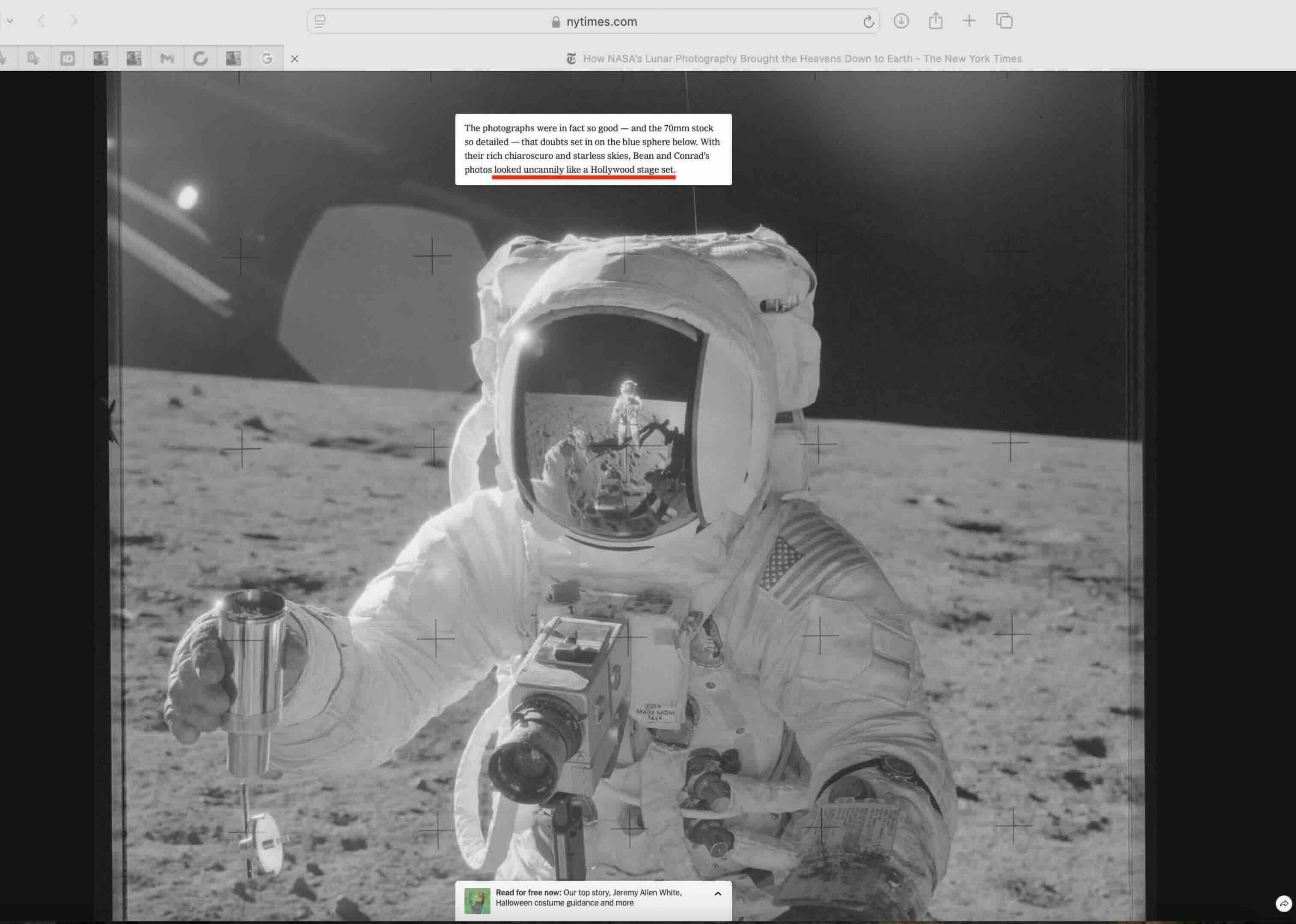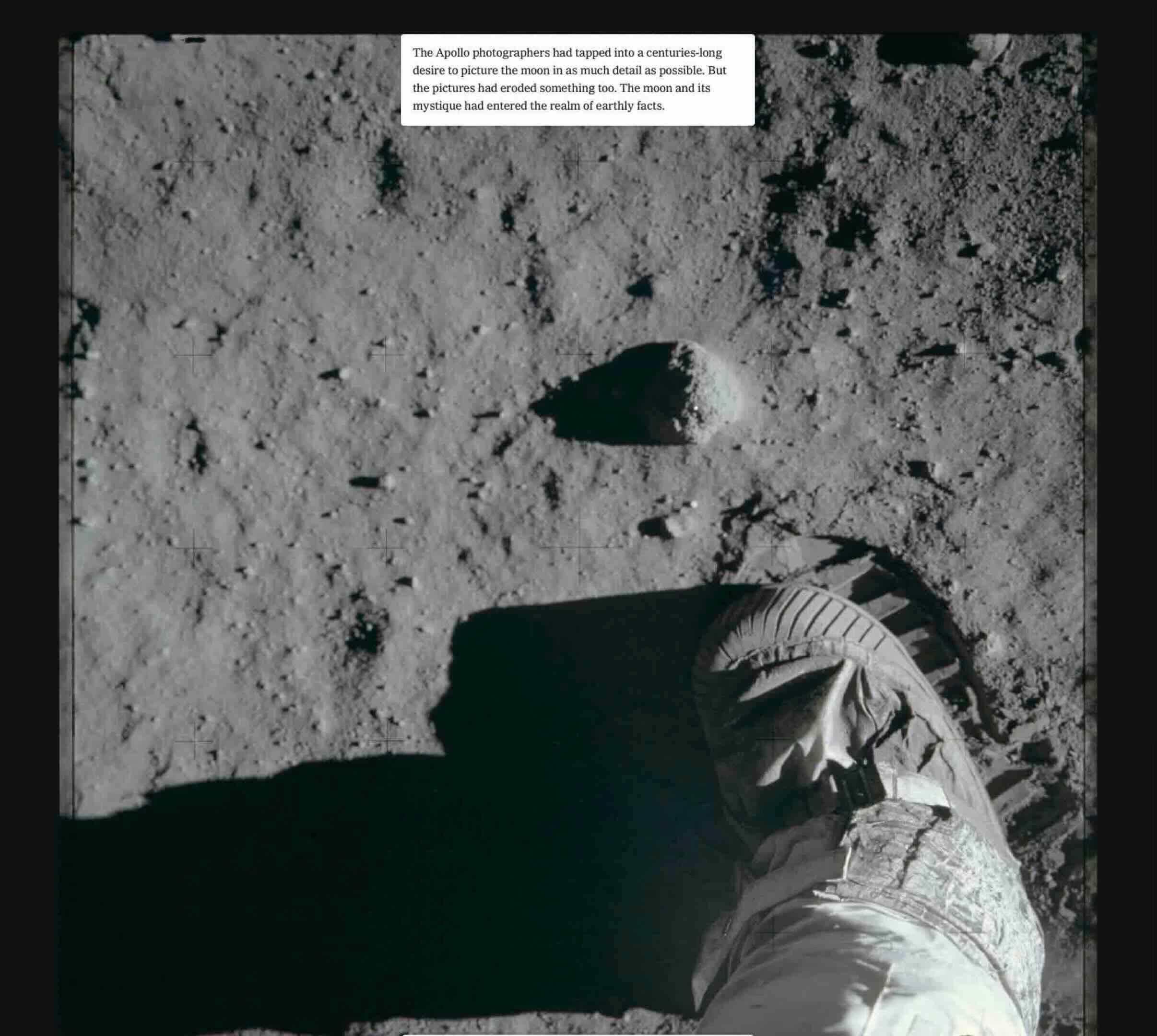 Let’s look at our slideshow. We’re going to do a close read on this New York Times photo exhibit. Here’s their opening shot. They’re really ecstatic about the artistic quality of the moon landing photos. And in a couple of places, they actually mention that it looks almost suspicious. These photos are almost too good to be true. What do you think, Max?