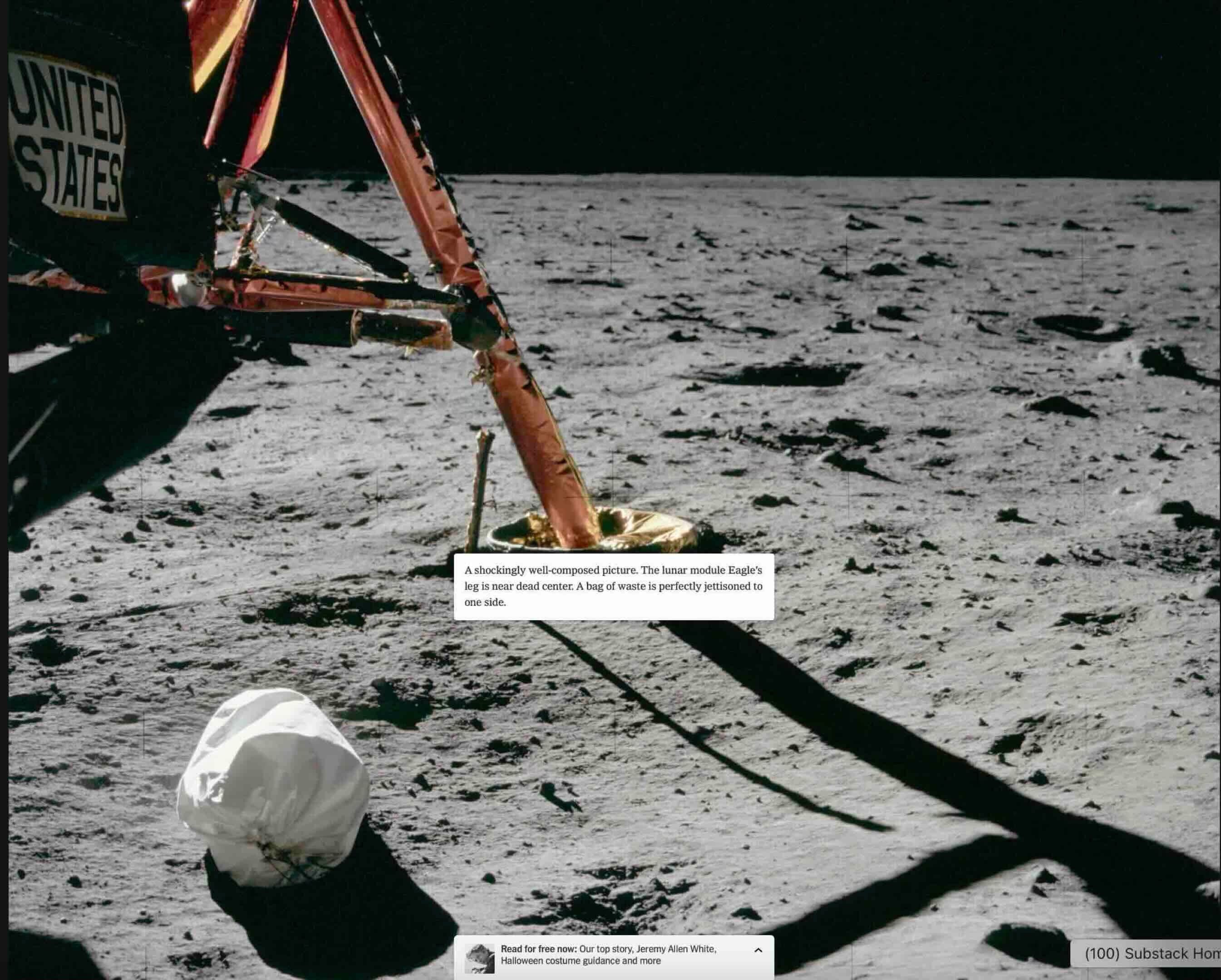 “The lunar module’s eagle’s leg is near dead center. A bag of waste is perfectly jettisoned to one side.” So maybe they’re telling us it’s all a bag of waste. I don’t know.