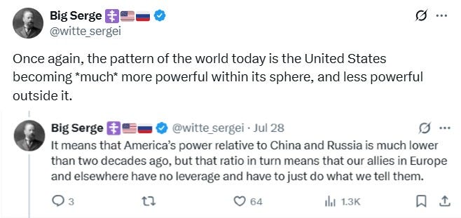 Trump made waves this week with his major economic subjugation of Europe on the announcement of his 15% tariffs, made before a stooped and servile Ursula von der Leyen. But as with everything which pours forth from the Trump administration’s victory fountain there are finer nuances worth a closer examination.