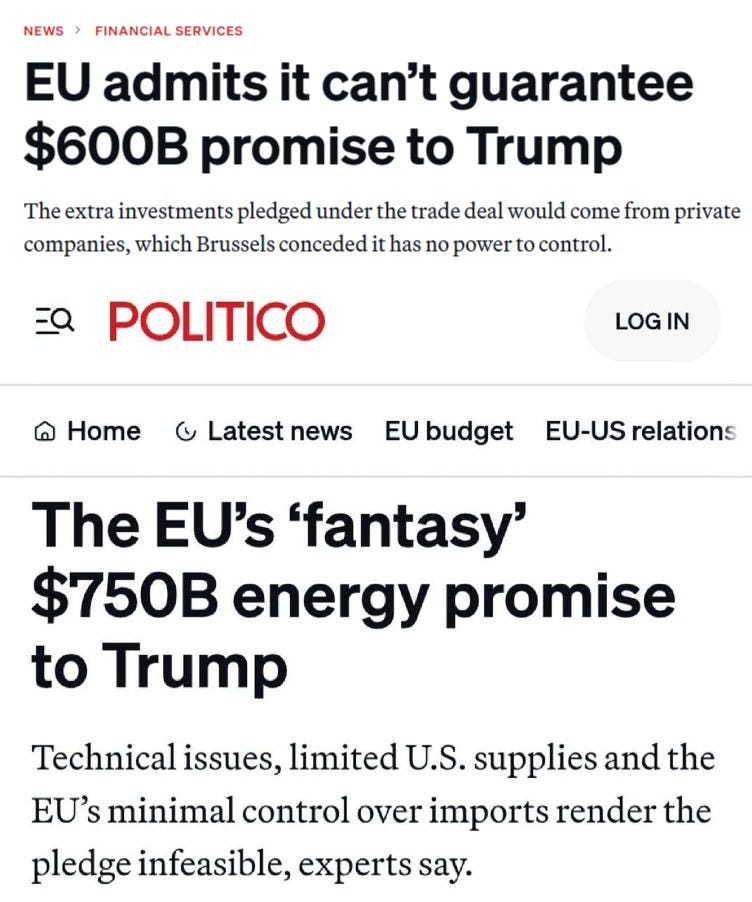 One might argue: but these “higher prices” and consumer pains are balanced by the EU’s promise of monumental investment in the US economy with the aforementioned trillions in LNG and other so-called purchases. The problem is, these figures appear made out of thin air in the same now-popular practice so regularly witnessed in Ukraine: where for instance Patriot missiles were promised only to have Germany and others subsequently squabble over who’s paying for what or how.