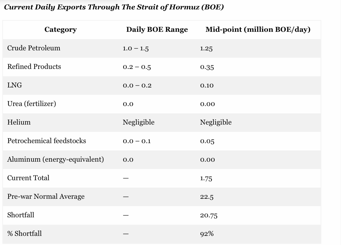 That is, the global above ground storage tanks for oil and gas liquids are being depleted at a rate of upwards of 20 million BOE/day. As shown below, Grok 4 estimates that the normal pre-war flow in BOE (barrels of oil equivalent) was 22.5 million/day for hydrocarbons sourced inside the SOH (strait of Hormuz), including the derivative products like LNG, urea, sulfur and helium which come from oil and gas.