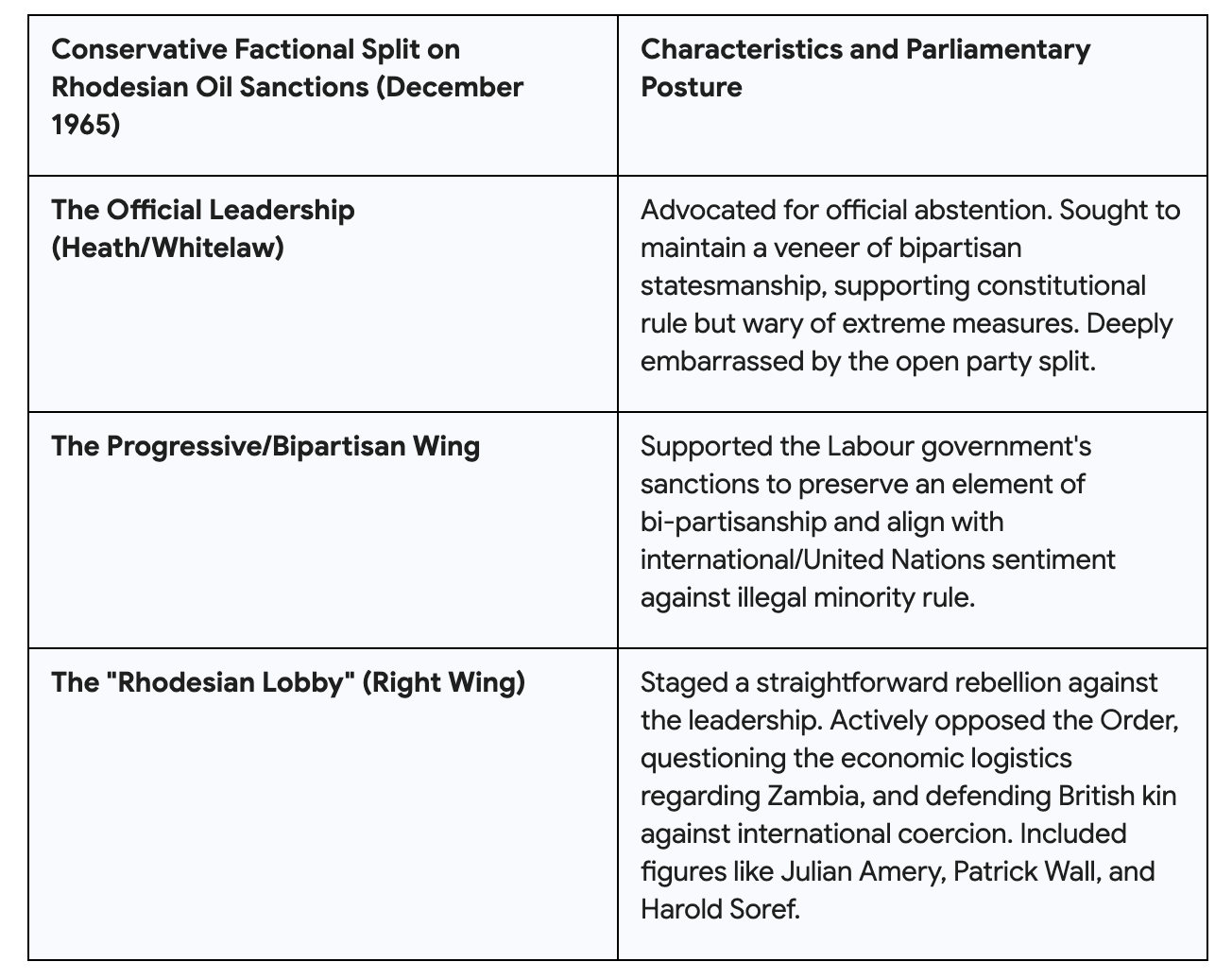 The crisis illuminated the latent divisions within British Conservatism regarding the end of empire and the moral obligations of kinship. When the Labour government introduced the Southern Rhodesia (Petroleum) Order in December 1965, the Conservative Party fractured spectacularly.