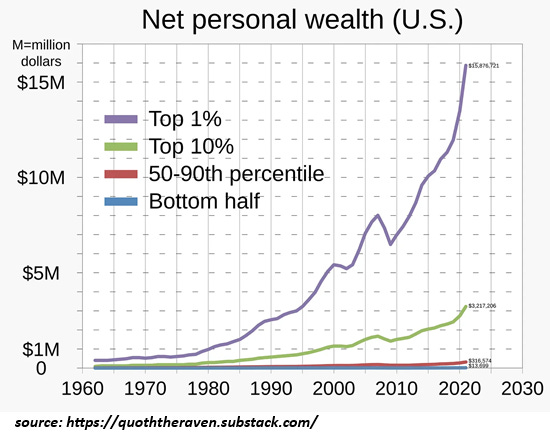I’ve set aside our standard of living in favor of our quality of life because standard of living is so easily gamed with financial statistics. You know the drill: as life becomes increasingly unaffordable and precarious, we’re inundated with statistics purporting to back up the claim that life is getting better, every day, in every way, because Progress is, well, progressing, and AI is soon going to make everything better in ways we can’t even imagine.