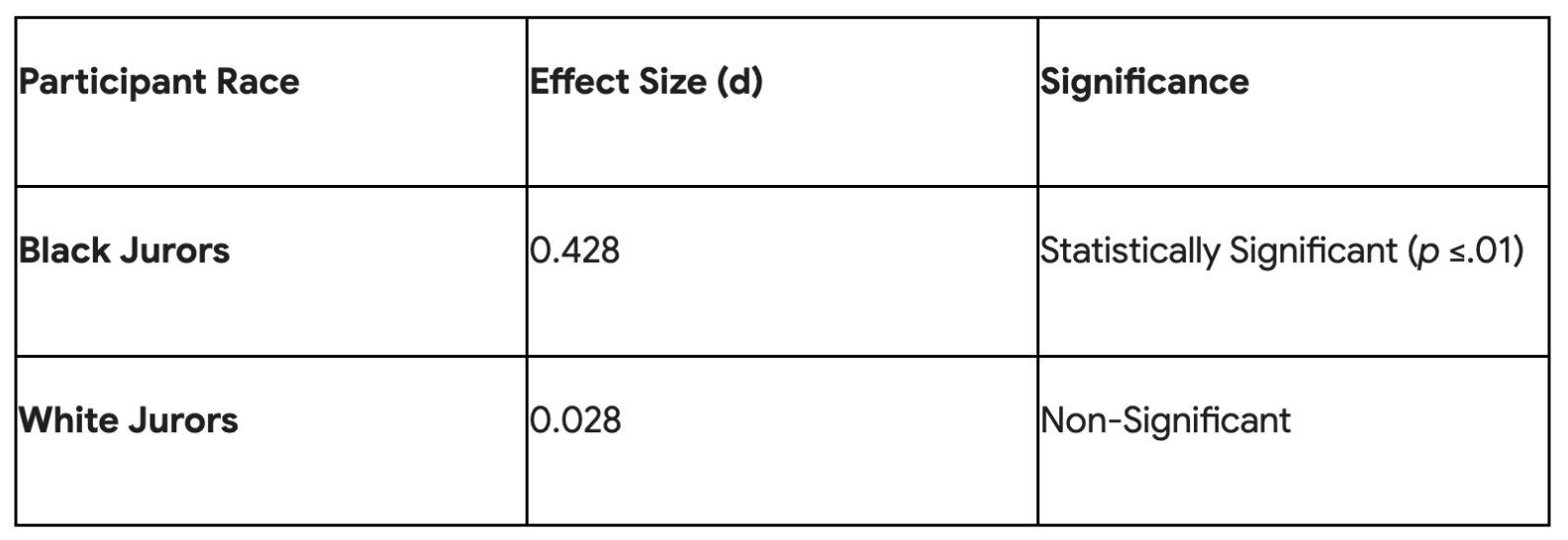 The table tracks the effect size (d) of racial bias, where a positive number indicates a tendency to render harsher judgments against out-group defendants and more lenient judgments for in-group defendants. The data shows that Black jurors exhibit a moderate, statistically significant in-group bias effect size of d = 0.428.12 In sharp contrast, White jurors demonstrate a negligible, statistically non-significant effect size of d = 0.028.13