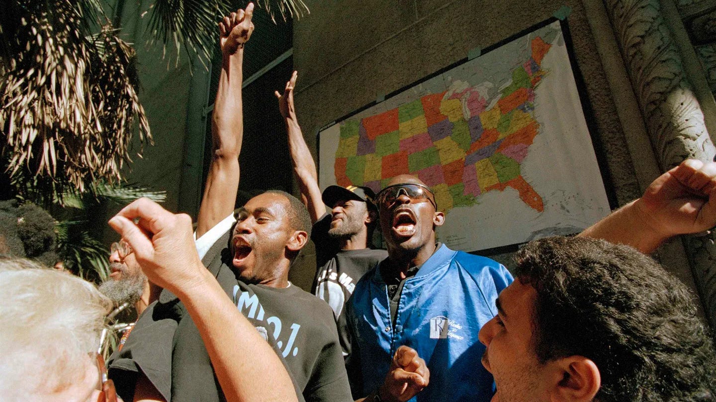 Supporters of O.J. Simpson react outside the Criminal Courts Building to the verdict of not guilty in Simpson’s double-murder trial in Los Angeles, Oct. 3, 1995. The former football star and broadcaster was accused in the deaths of Ronald Goldman and his former wife Nicole Brown Simpson. AP Photo/Elise Amendola
