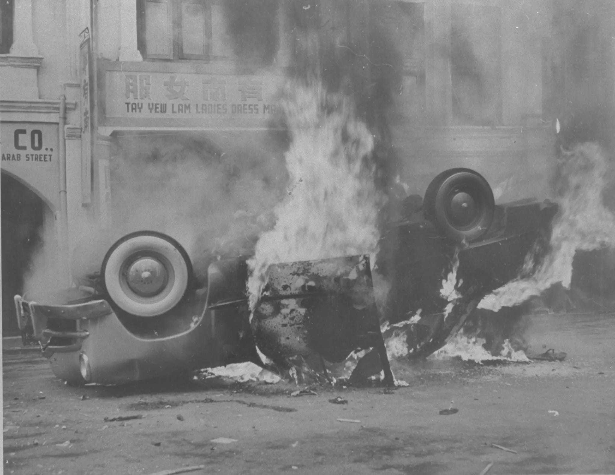 A car set on fire by rioters, who vented their anger at Europeans and Eurasians after the court ruled in favour of the Hertoghs.