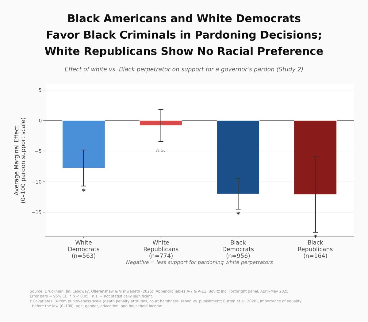This dynamic is further corroborated by the US pardoning-decisions bar chart titled “Black Americans and White Democrats Favour Black Criminals in Pardoning Decisions” (Druckman et al. 2025).14