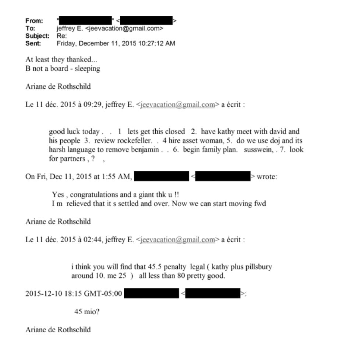 Another thread shows Epstein intervening in a Rothschild-linked Swiss banking crisis, helping cut a looming $80 million DOJ penalty nearly in half. His messages with Ariane de Rothschild are the language of an insider: coordinating attorneys, shaping the institutional defense, and directing internal actions — “remove Benjamin,” “hire asset woman,” “begin family plan.” This is not improvisation. It is operational fluency within U.S. power structures.