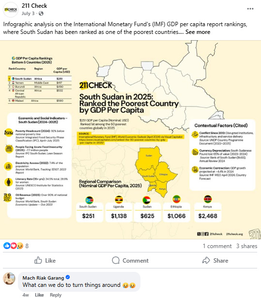 I suspect that these trainings, facilitations and solutions are mainly a publicity distraction, and that the Hate Defiers have in fact pissed away most of their one-million-Euro grant on a strange website called 211 Check, which provides “fact-checking and information verification in South Sudan.” 211 Check employs a whopping six people, including a “Team Lead,” an “Editor” and with that kind of managerial overhead four surely over-supervised “fact-checkers,” some of whom double as “media monitors.” Judging from the extremely sparse output of 211 Check (their last piece was published a month ago) there are precious few facts to check in South Sudan. There are also precious few readers, if social media is any clue. 211 Check have racked up an astounding 226 subscribers on YouTube, 245 on Instagram and 1,405 on Twitter, where their posts routinely go entirely ignored. Their only meaningful presence is on Facebook, where their 7,100 followers occasionally drop a thumbs-up or two on a post. Only very rarely, however, do the number of Facebook interactions exceed the number of staff employed by 211 Check.