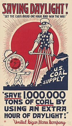 Across the pond, the first U.S. law on Daylight Saving Time went into effect on March 19, 1918, for the same fuel saving reasons, about a year after the country entered the war. But again, though the official reason was fuel saving, the U.S. Chamber of Commerce was the major backer for the policy, because Americans getting off work while it was still light out meant they would be more likely to go out shopping in the evening.