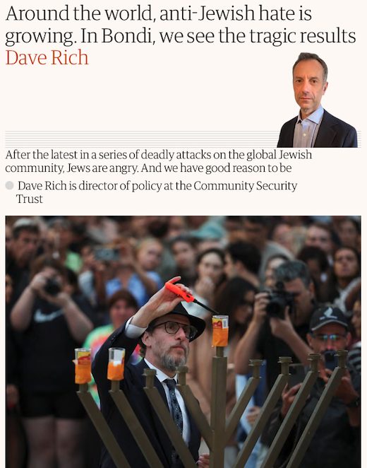 Rich: “The mobile phone footage of two gunmen calmly taking aim at families enjoying a Hanukah party is utterly chilling. It takes a special kind of dehumanisation, an ideology of pure hatred and self-righteous conviction, to do that.”