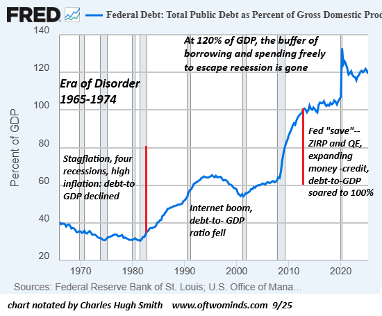 Note the debt-to-GDP ratio actually declined during both the stagflationary 1970s and the 1990s Internet boom. In both eras, the economy was still largely organic, i.e. unmanipulated enough that natural forces (supply, demand, risk aversion, writedowns of bad debt, etc.) could work through excesses of speculation and debt and restore not just balance sheets but legitimacy.