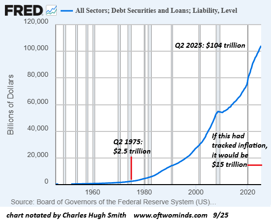Here is total debt, public and private (TCMDO). In Q2 1975, total debt was $2.5 trillion. If this had tracked inflation, it would have reached $15 trillion by Q2 2025. ($1 in Q2 1975 is $6 in Q2 2025.) (BLS Inflation Calculator)