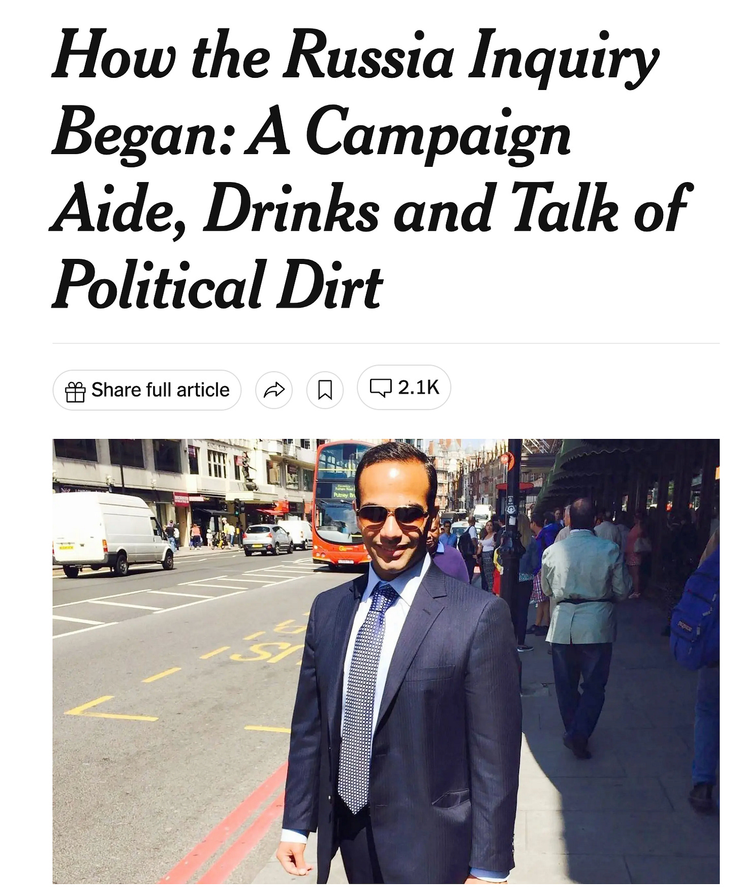 This paragraph is an outrage. It’s carefully written to conceal how utterly the Times botched one of the most impactful stories of the Russiagate affair, a story called “How the Russia Inquiry Began: A Campaign Aide, Drinks and Talk of Political Dirt.” This professed to be the origin story of Russiagate, explaining that on July 26th, 2016, four days after Wikileaks leaked thousands of documents damaging to the Democratic Party, Australian authorities told American counterparts about a suspicious Russia-themed conversation Trump aide George Papadopoulos had with a diplomat named Alexander Downer.