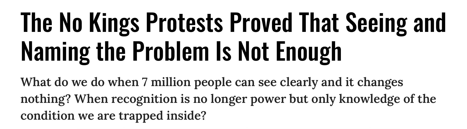 This is not merely a misdiagnosis. It is the misdiagnosis — the load-bearing delusion that converts outrage into system maintenance. This is the deeper trap of the No Kings rallies: recognition without structural analysis is not solidarity, but a shared misdiagnosis that leaves power undisturbed. Real solidarity begins not when people gather to acknowledge the wound, but when they stop believing the knife can be used to heal the wound it inflicted.