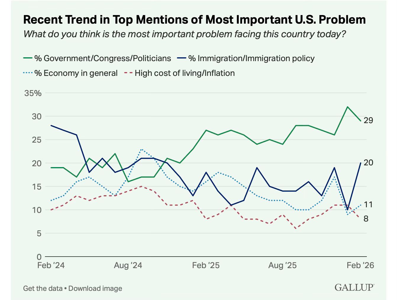 Many Americans correctly identify the disease but misdiagnose the cause. The correct answer — that the system is producing these outcomes on purpose — is not among the choices. Source: Gallup (Feb. 2026)