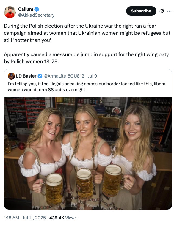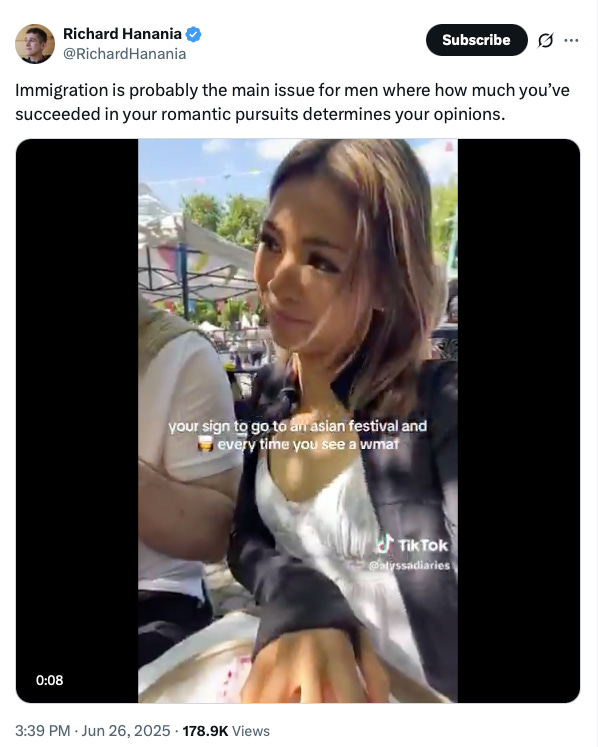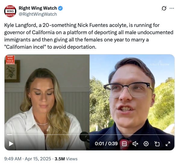 There is the open borders for hotties meme and a proposal by America First candidate for California governor, Kyle Langford, to deport male illegal immigrants while letting the females stay if they marry California incels. While not realistic, these proposals are more explicitly tapping into the psychosexual component of immigration policy. Also, my friend