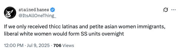 A lot of psychosexual undercurrents end up subconsciously influencing immigration policy. I suspect that neoliberal White tech bros who signal for more high skilled immigration, do so because they desire for there to be more cute Asian women for them to date. White men want to go down on upper class coded college aged Chinese and Indian women while not having to deal with the bullshit of the neoliberal dystopia of Silicon Valley that involves competing with millions of H1bs.