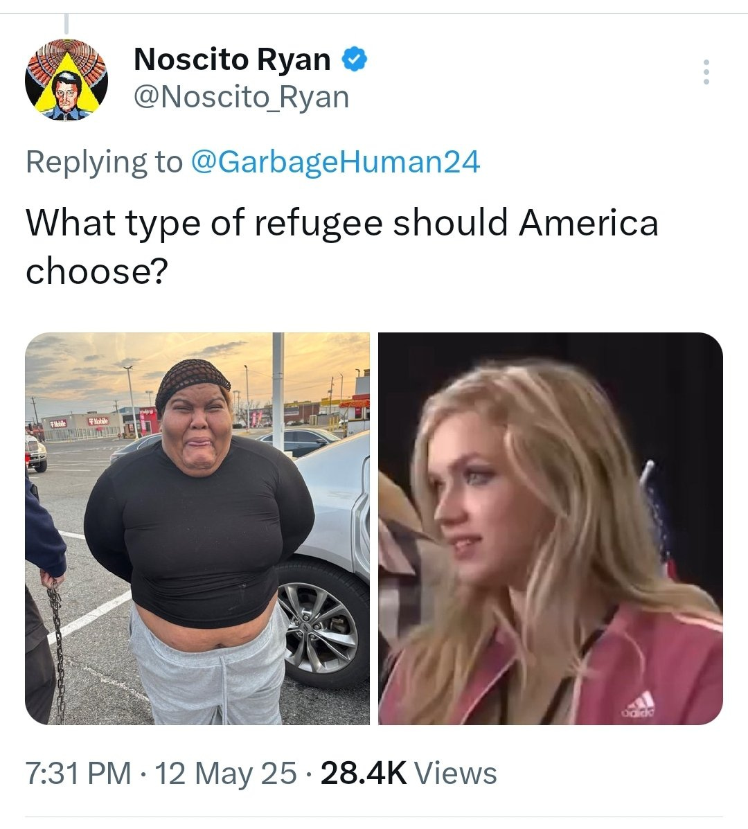Trump granting refugee status to White South African Afrikaners is framed as extending liberal humanitarian policies to fighting anti-Whiteness. However, rigthwing men who support this have this fantasy about going down on beautiful blonde Afrikaner women. For instance, dissident right Twitter was posting the image of an attractive Afrikaner refugee woman superimposed next to the image of the ugly migrant woman. Afrikaner women are tall and have this Germanic build with strong thighs that can trap a puny dissident right nerd in a head scissor lock hold while wearing khaki shorts that are extra sweaty. Nerdy socially isolated dissident right men view Afrikaners as a more virile White population that fits the Aryan ideal, so they support this as a eugenic immigration policy. However, this is healthier than low-T liberal White men fetishizing black and brown migrants as virile.
