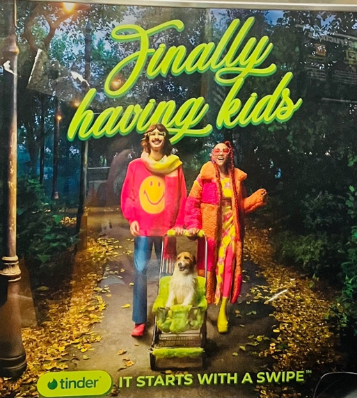 So why the ad with “Finally having kids,” then? Don’t panic. The Tinder world is still committed to the decrease and disappearance of humankind. The couple in the ad are certainly not going to commit the atrocity of having a human child. Their “kid” is a dog.