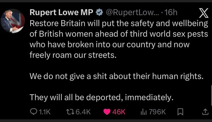 Several ultra-far-right parties have been refused registration under this purported power, despite having aims and objectives much more vaguely and moderately worded that Rupert Lowe’s “millions must go” stance. Take another look at his X post illustrating this article. Yes, of course I agree with it, but do you really think the liberal quangocracy will reward this with party registration – unless it suits them?