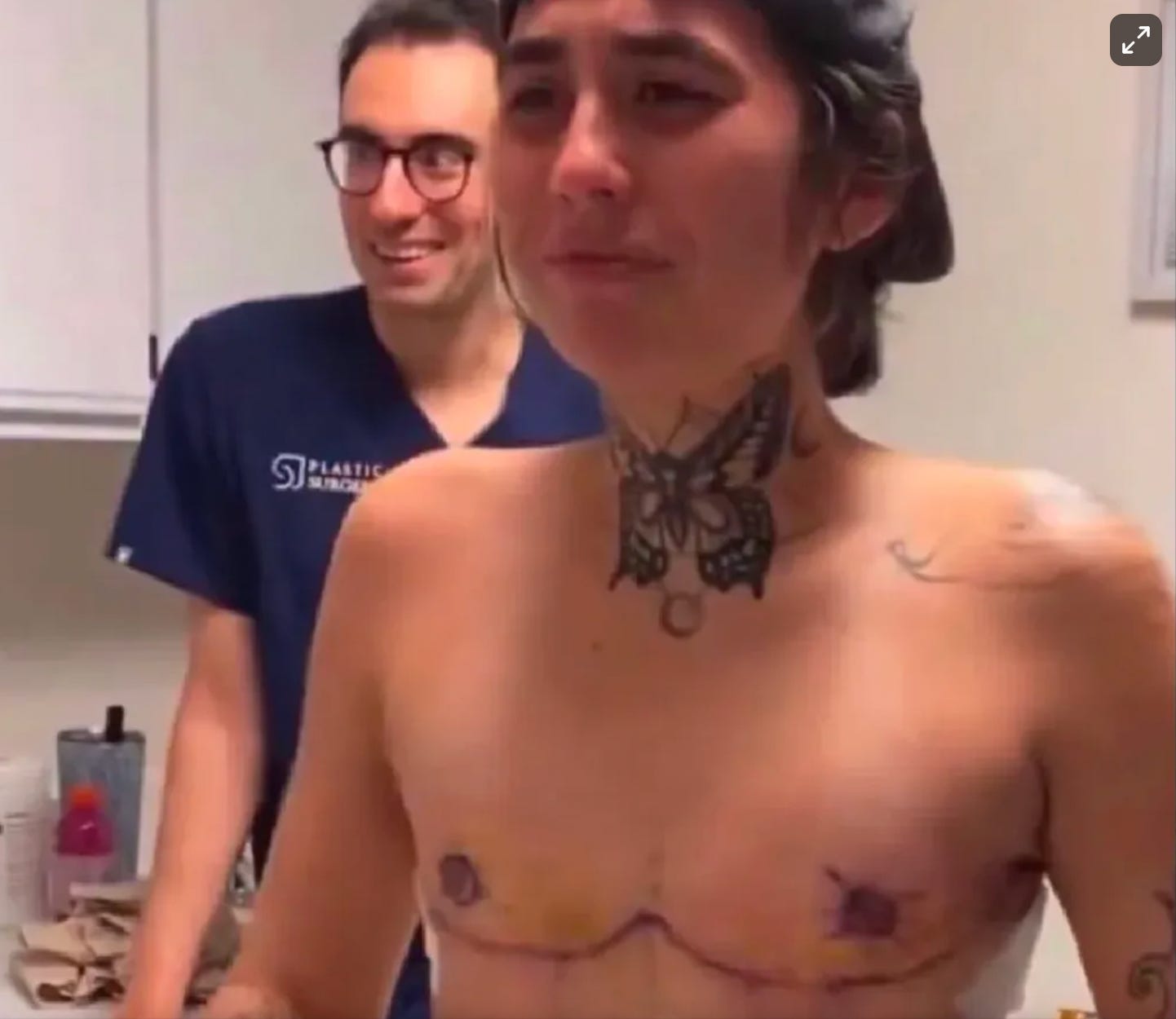 The following image appears to be that of a young girl who has received a double mastectomy in order to realize her fantasy of becoming a boy. The butterfly tattoo on her throat reminds me of Jame Gumb—AKA “Buffalo Bill”—for whom the death’s-head hawkmoth symbolizes metamorphosis from female to male.