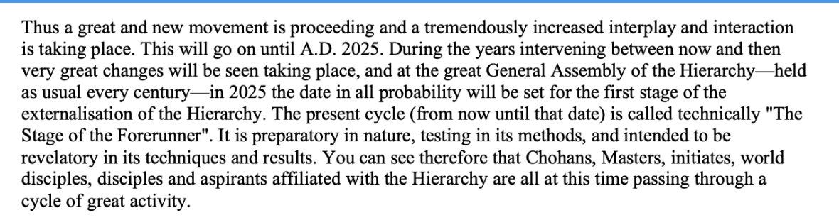 As I’ve written about before, Alice Bailey (founder of the Lucifer Trust, who was essential to the formation of the UN) wrote about the “externalization of the hierarchy” almost 70 years ago – hidden structures of power becoming visible because the conditions of the age demanded it. She specified 2025 as the year things would come to light.