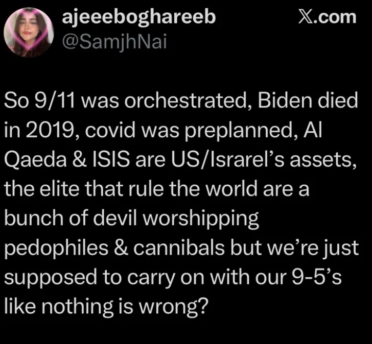 My Q friends (yes, I have Q friends) tell me these are controlled releases of doses the public can metabolize – slow drips because the full truth would break society. There’s a twisted logic to that I can’t totally dismiss. But I also can’t embrace a framework that requires trusting that the same unseen power structures responsible for the cover-up are now engineering the disclosure out of benevolence. That’s a pretty big ask, in my opinion.