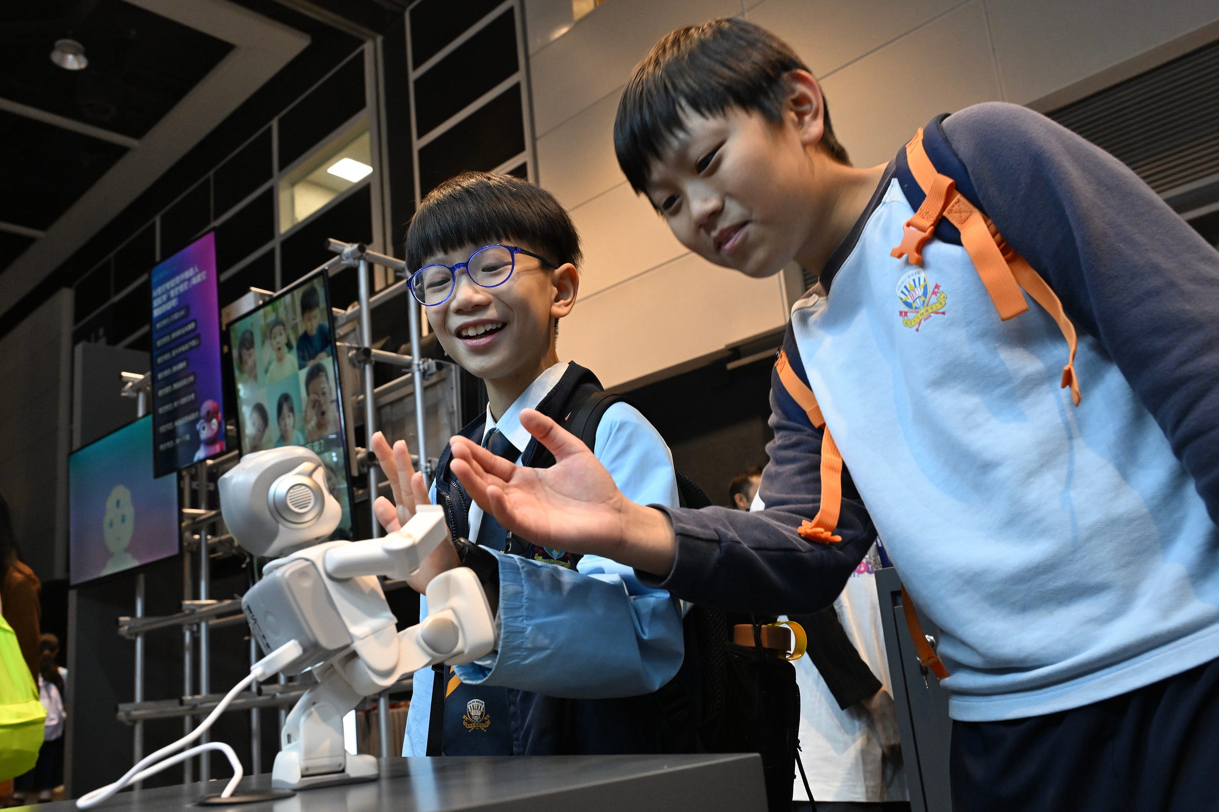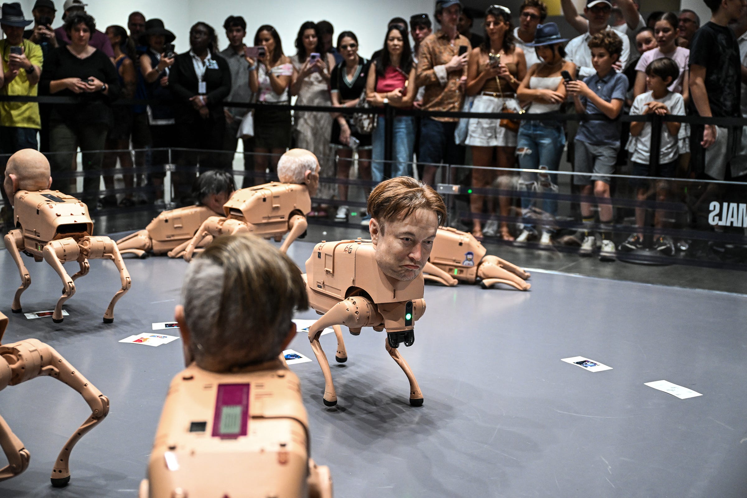 Wax heads of Mark Zuckerberg and Jeff Bezos are seen on robot dogs as a part of an art installation called “Regular Animals” by digital artist Mike Winkelmann, also known as Beeple, during Art Basel 2025 at Miami Beach Convention Center in Miami Beach, Florida, December 7, 2025.