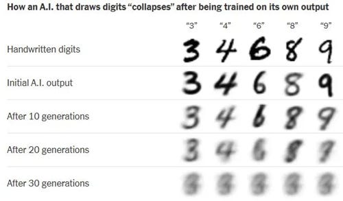 As I explained in Model Collapse: The Entire Bubble Economy Is a Hallucinationmodel collapse is the inevitable result when those controlling the model’s gearing / programming begin using the output of their previous results (output) to “train” the next iteration of their “knowledge,” i.e. what they consider knowable and known.