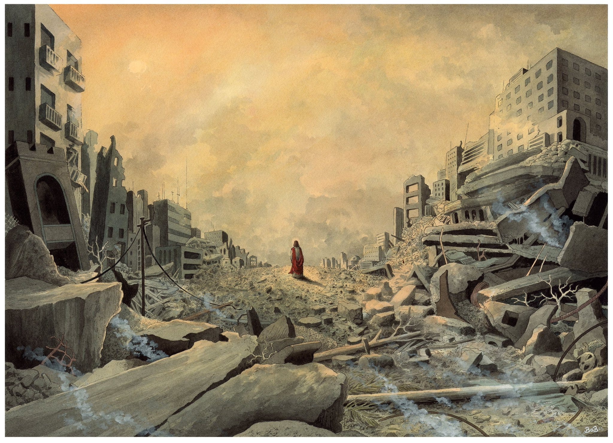 Christ in the ruins of Gaza (from Bob Moran). Israel has stated its wish to make a Gaza of Lebanon and Iran.