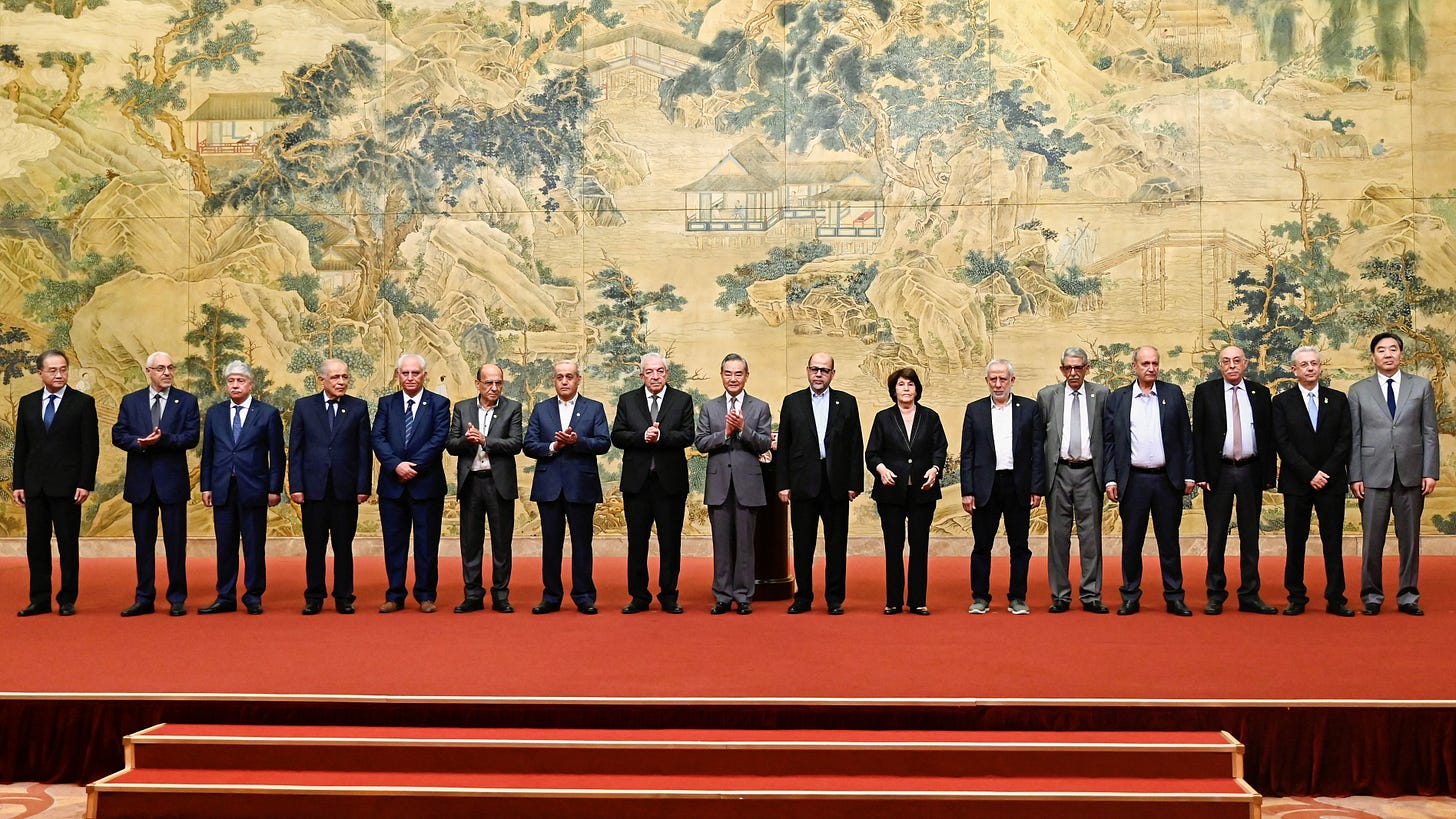 China’s Foreign Minister Wang Yi (C) poses for a group picture with members of the Palestinian factions during the signing of the “Beijing declaration” at the Diaoyutai State Guesthouse in Beijing on July 23, 2024. (Photo by PEDRO PARDO/POOL/AFP via Getty Images).