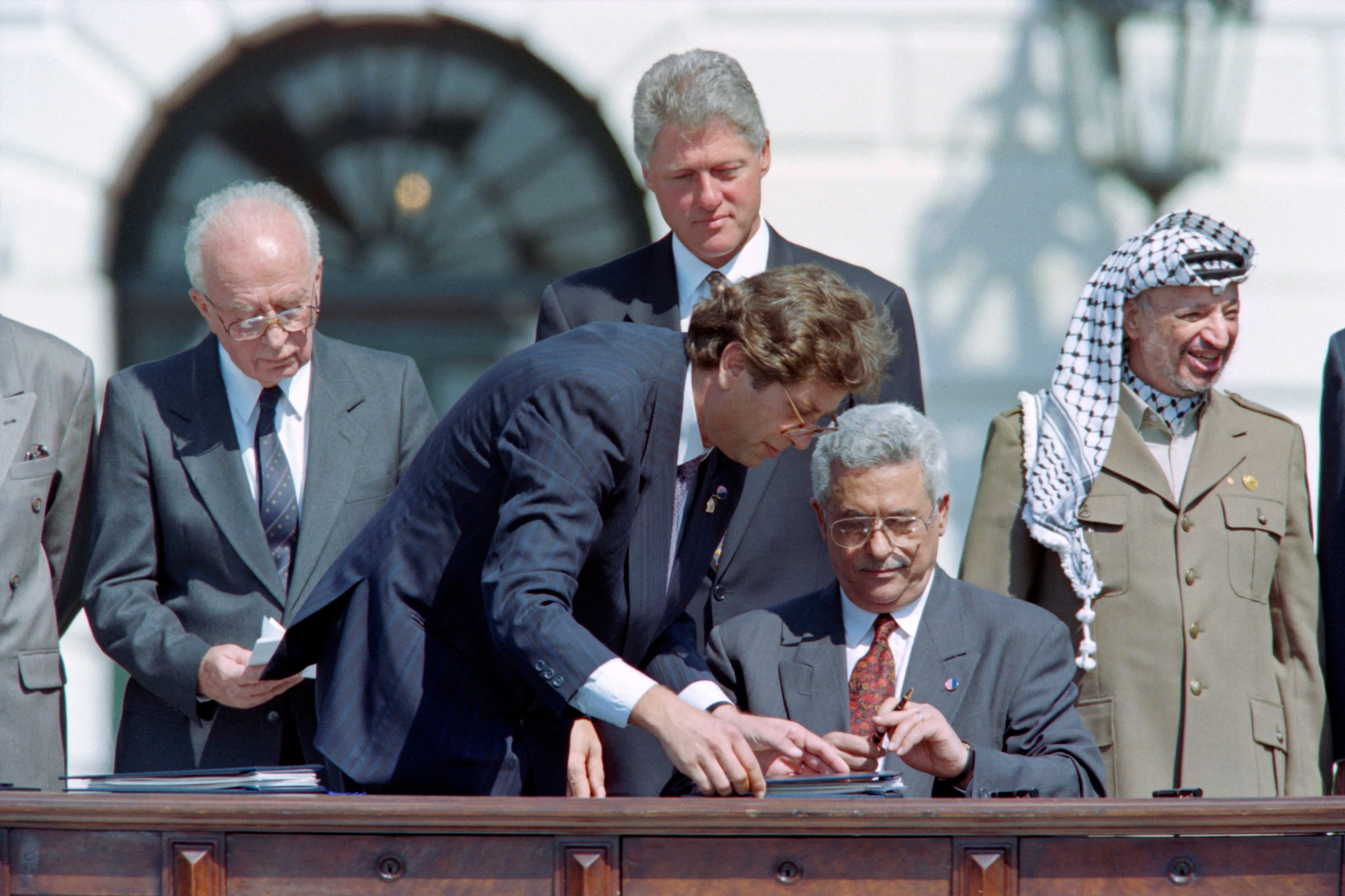 Mahmoud Abbas (2nd R) signs the “declaration of principles” as part of the Oslo Accords on September 13, 1993 in a White House ceremony. Israeli Prime Minister Yitzhak Rabin, an unidentified aide, US President Bill Clinton and PLO Chairman Yasser Arafat look on (Photo by J. DAVID AKE/AFP via Getty Images).