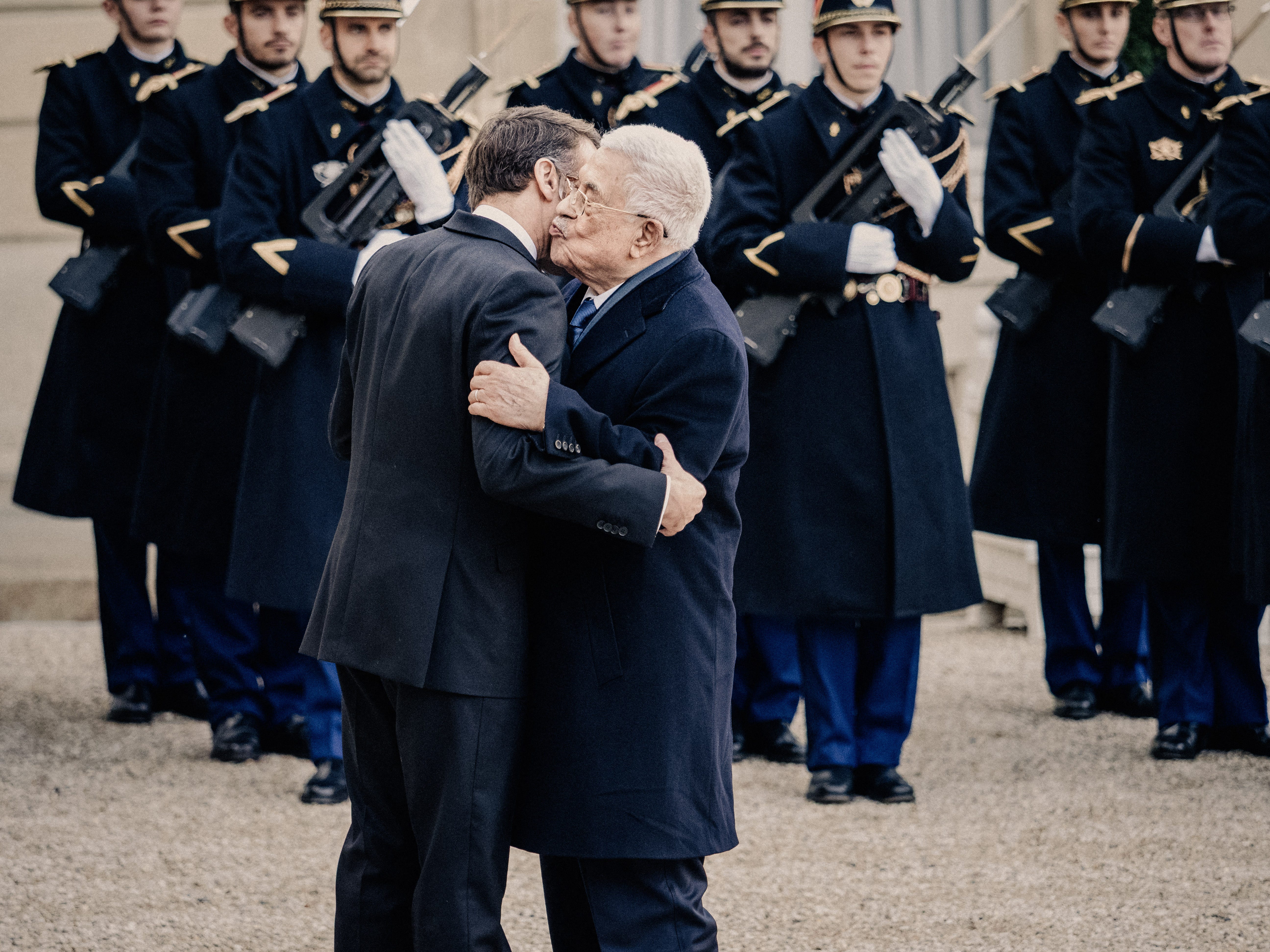 French President Emmanuel Macron embraces Mahmoud Abbas before a meeting at the Elysee Presidential Palace in Paris on November 11, 2025 (Photo by BASTIEN OHIER/Hans Lucas/AFP via Getty Images).