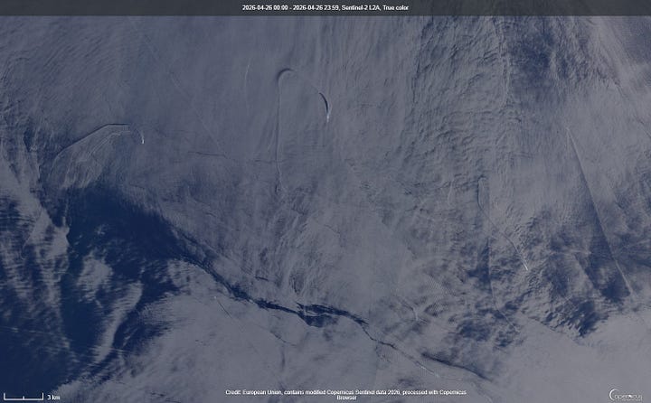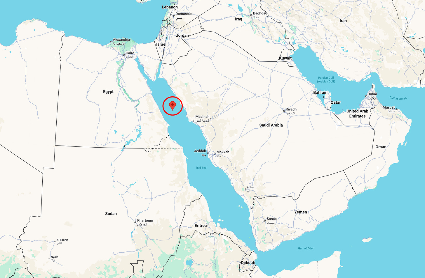 We happen to have gotten two new satellite geolocations. First, of the USS Gerald R Ford, which had been taken out of action due to a “laundry fire”, but has now returned to the Red Sea. It was reportedly seen pulling a hard and fast u-turn at geolocation 25.275, 35.964: