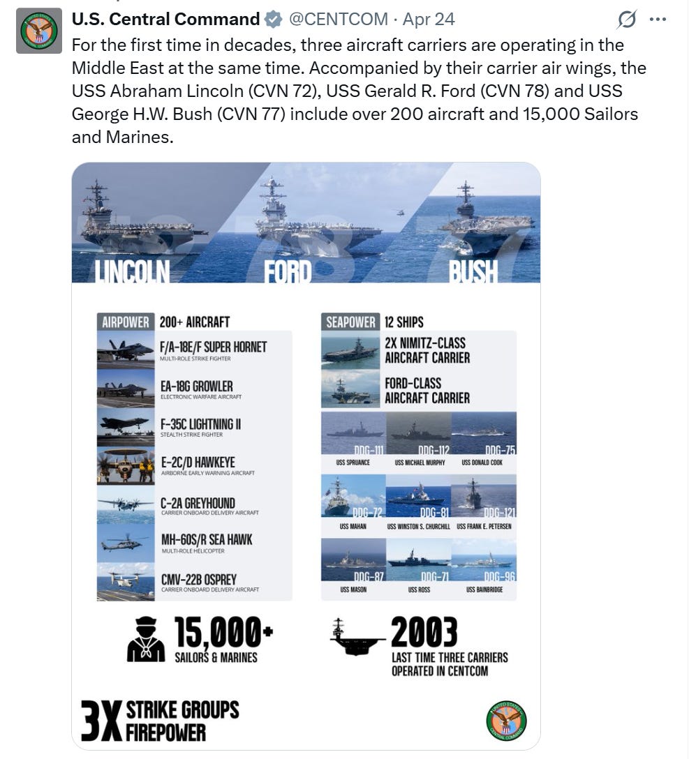 CENTCOM brags that this is the largest convergence of US naval power in the Mideast “in decades”: