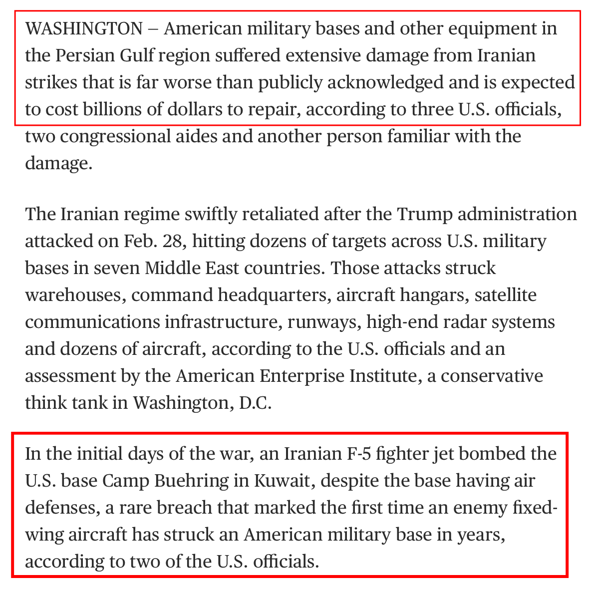 Most notably, the big revelation that touchstoned this release was the shocking admission that an Iranian F-5 jet had breached US air defenses and directly bombed the US Camp Buehring base in Kuwait: