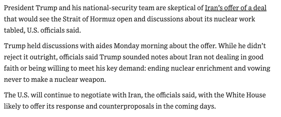 U.S. President Donald J. Trump has told advisers he is not satisfied with Iran’s latest proposal to reopen the Strait of Hormuz and end the Iran War, which calls on the United States to lift its ongoing blockade and postpones nuclear talks till after the conflict is over, according to multiple people briefed on discussions in the White House Situation Room who spoke to The New York Times.