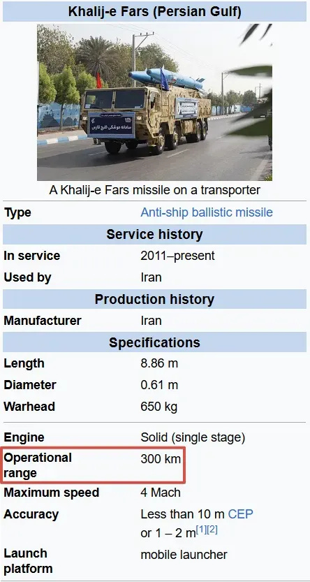 Why is that ~300km range key? Because, those who read my breakdown of Iran’s anti-ship capabilities here will recall that Iran’s anti-ship ballistic missiles pretty much cap out at 300km range, which marks this as the exact distance that US carriers dare venture to near Iranian shores in order to stay just a hair’s length outside the envelop while still pretending to act ‘tough’ and show some kind of phony “resolve”. You’ll note the exact measurement is actually 331km, which means they’re cautiously keeping just outside Iranian range—and in fact, it’s more than that, given that Iranian launchers would be dozens of miles inland, not sitting right on the shoreline, so the real total range from Iranian missiles is likely 375-400km.