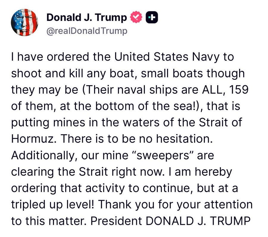Many believe that once USS Bush arrives, Trump will be primed to unleash another round of futile strikes. It’s obvious that Trump is still desperate for an off-ramp and the only way he’d launch another major attack is to get out of dodge with a cheap bit of “victory” theater: “See, now we’ve OBLITERATED all their power plants and have decisively won the war, now we’re going home!”