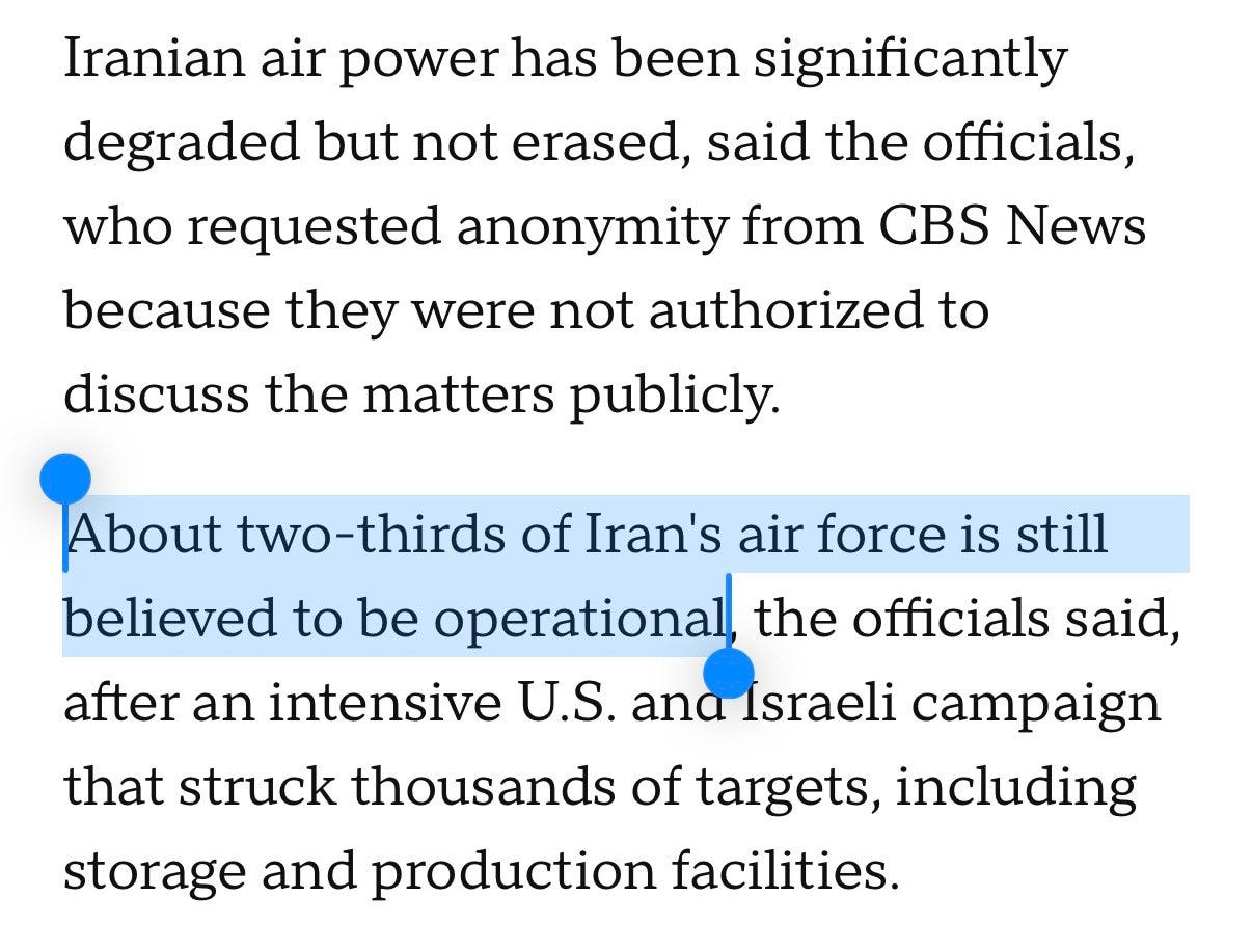 At the same time, estimates regarding Iran’s remaining military capabilities continue gradually sliding upward, as predicted. Trump had claimed Iran’s airforce was “completely destroyed”, but CBS now reports that “two-thirds of Iran’s air force is still believed to be operational”: