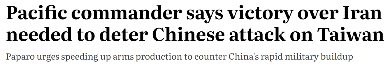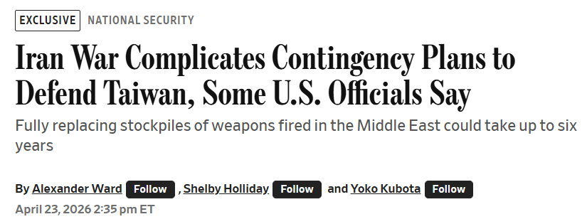 WSJ now reports that the Iran war has snuffed out hopes of US standing any chance in helping Taiwan during a hypothetical Chinese intervention: