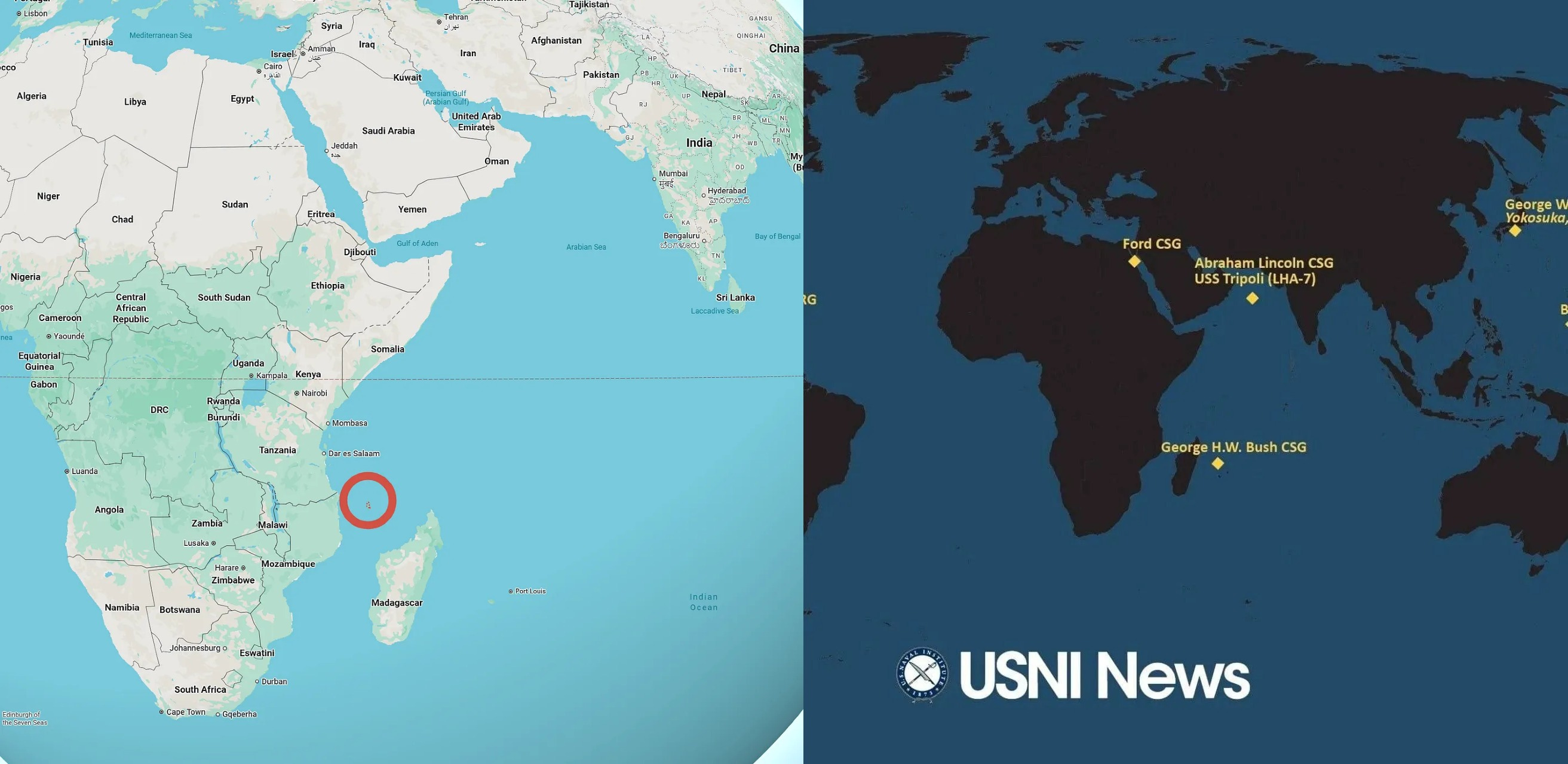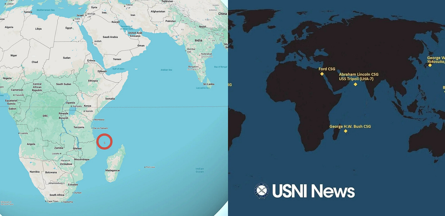 Recall this is the carrier that was forced to trail its rust around the southern cape of Africa because it was too terrified of being converted to a bathysphere by the Houthis of Bab al-Mandab. Intrepid observers, though, believe CENTCOM is lying as aircraft from the USS Bush were spotted on tracking programs hovering around the carrier group around here: