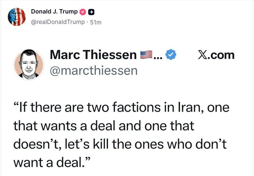Given the dilemma, and given this retweet by Trump himself, he may elect to just keep bombing until “someone to talk to emerges”—unlikely as that prospect is.