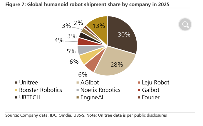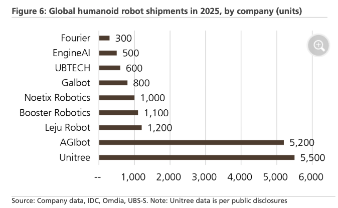 Wang noted that 2025 humanoid robot shipments totaled about 18,600 units, with most shipped by Chinese robotics companies, including roughly 5,000 units each from Unitree and AgiBot, for a combined total of about 10,000.