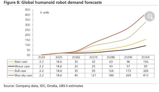 We maintain our global demand forecast of 30,000 humanoid robot units in 2026. We see upside risks if AI development accelerates or client feedback boosts increased adoption. Our bull case and blue-sky case forecasts for 2026 are 35,000 and 40,000 units, respectively. We flag upside risk to our 2027-28 demand forecasts if robots used in industrial settings make significant progress