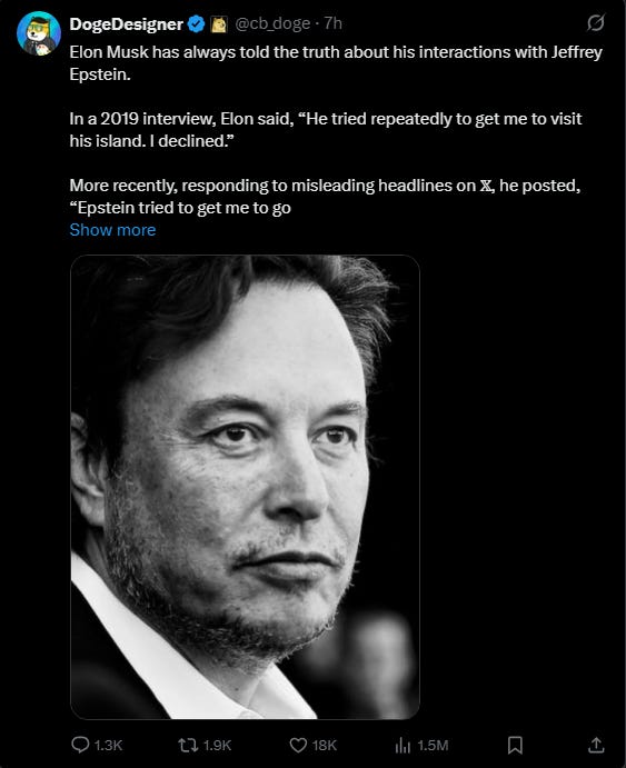 That is a far cry from the narrative that Musk was somehow “in on” Epstein’s trafficking operation.