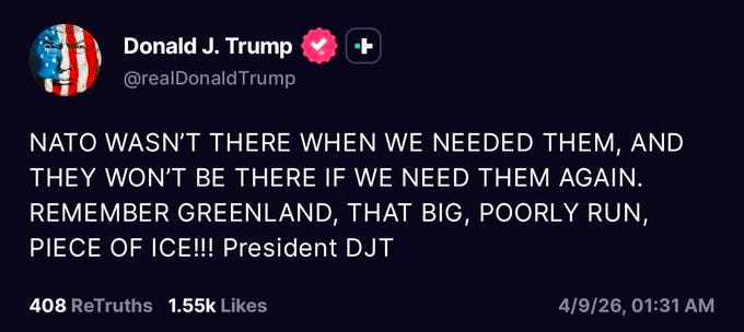Second came Trump’s inability to conceal his rage at the shambolic failure and Iran’s refusal to submit, which led to his vulgar, profanity laced “civilization ending” social media tirades over the weekend. In my speculation, a line in the establishment must have been drawn. The reset required not only a pause to retool militarily but also politically. Thus the ceasefire theater. The desperation for a ceasefire—before Iran could call Trump’s deadline bluff—was so serious that the US was forced to accept Iran’s maximalist position. That, of course, has been discarded amid a blizzard of lies. But the truth is out: