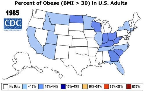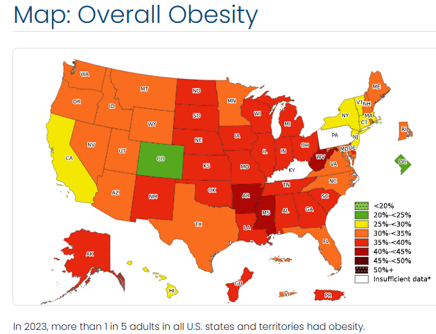 2. Our collective health is systemically worse. These charts from the Center for Disease Control (CDC) tell the story: in 1985, relatively few Americans were classified as obese (BMI of 30 or higher). While BMI is not an ideal measure, moderate BMI levels reflect a lifestyle of moderate activity and relatively healthy diet. By 2023, the situation had deteriorated to the point that by more recent metrics, almost 80% of adult Americans are overweight/obese, conditions that generate a spectrum of health risks.