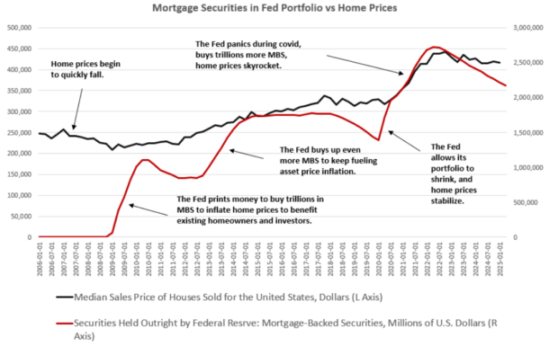 And finally, there is the most deliberate and egregious tactic of all: since 2008, the central bank has bought up trillions of dollars worth of mortgage-backed securities with the explicit purpose of ensuring that home prices did not fall substantially. This policy has been used repeatedly as a form of corporate welfare to ensure that banks and other financial institutions—which may hold enormous amounts of mortgage-backed securities—don’t have to endure financial stress due to falling home prices.